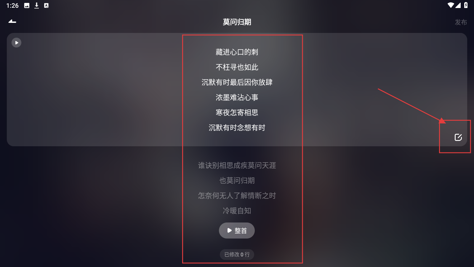 3、在改词页,针对歌曲《莫问归期》,点击右侧编辑图标,对歌词进行个性化修改。