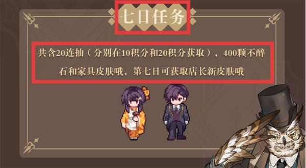 3、关注七日任务,努力完成任务获取积分,在10积分和20积分时分别获取连抽机会,积累不醉石、家具皮肤、获取店长新皮肤等奖励。
