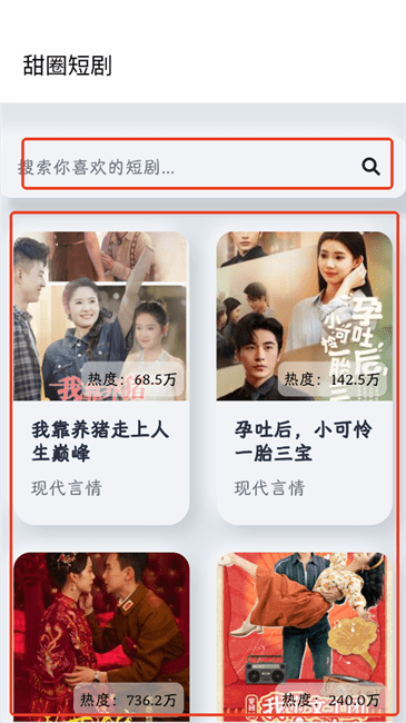 1、打开甜圈短剧APP,在首页搜索框搜喜欢的短剧,或选推荐短剧(如【我靠养猪走上人生巅峰】等)。