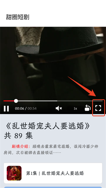 2、点进短剧播放页(如【乱世婚宠夫人要逃婚】),点击屏幕右侧【全屏】按钮,进入全屏播放模式。