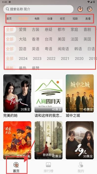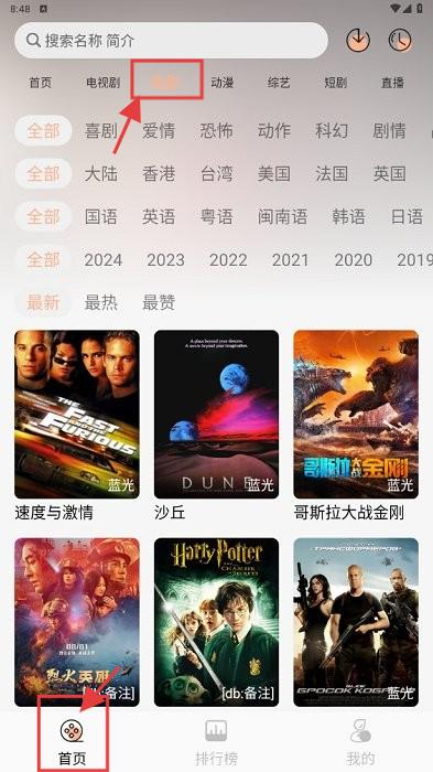 1、打开影视应用,在【首页】,通过顶部标签及题材、地区、语言、年份筛选项,查找想看的影视内容。