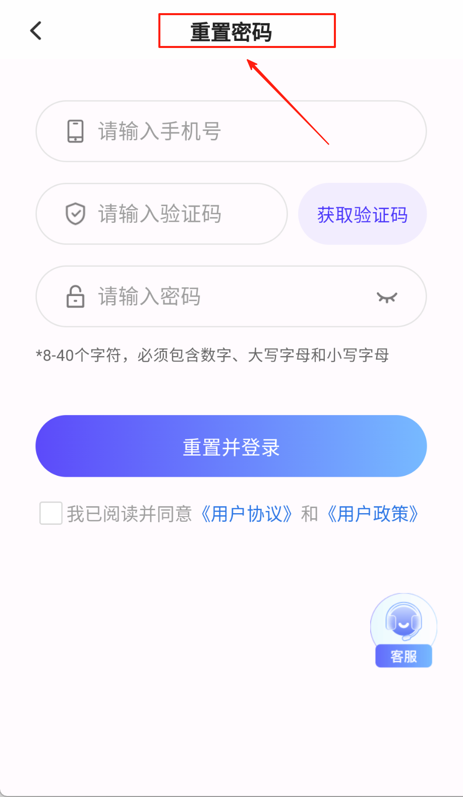3、重置密码先输手机号取验证码,按要求设含大小写数字的新密码,勾协议框点重置就能同步登入就好哦。