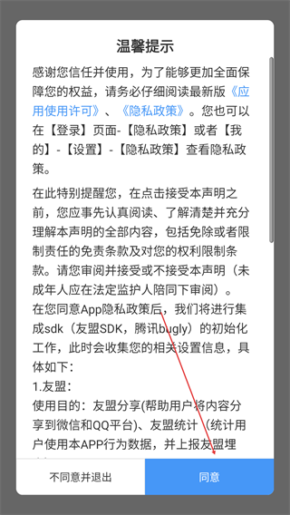 1、在应用启动后的温馨提示弹窗中,点击【同意】按钮,进入登录页面。