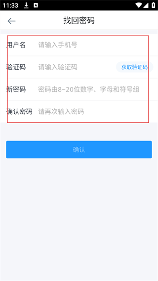3、在找回密码页面,依次输入手机号、点击“获取验证码”并填写收到的验证码,再设置符合要求的新密码及确认密码。