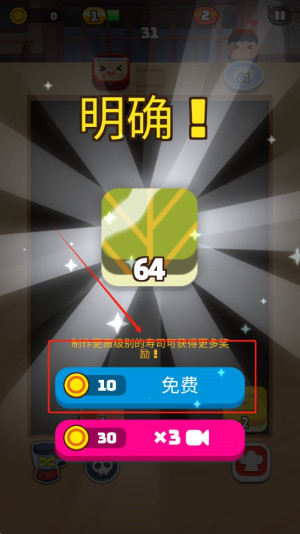 3、完成制作:在游戏中,成功制作指定级别的寿司后,点击“免费”按钮获取奖励。