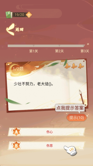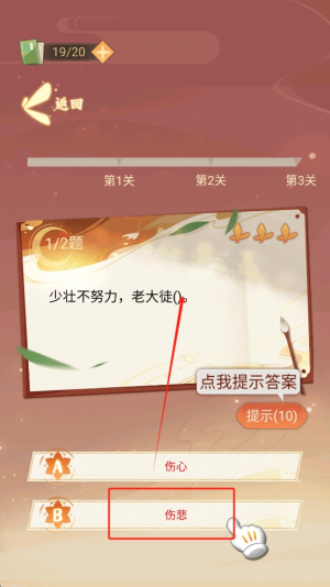 3、开始答题:在答题界面中,选择题目下方的选项,如“伤悲”,提交答案。