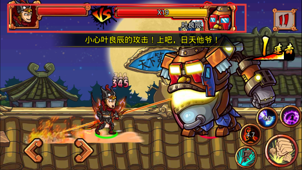 1、游戏开始,了解剧情背景,明确对战目标是叶良辰。熟悉屏幕下方左右移动键和右侧技能按键布局,掌握基本操作。
