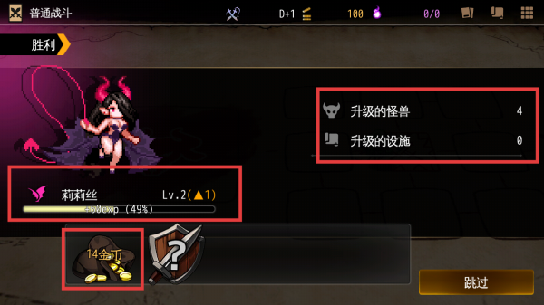 3、战斗胜利后,关注奖励,利用金币和经验升级角色与怪兽,提升战斗实力。持续参与战斗,解锁更多权能和玩法,推进游戏进程。