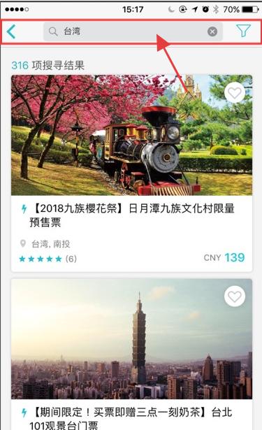 1、打开应用,在搜索栏输入目的地,筛选出相关行程,浏览行程卡片,选择感兴趣的点击查看详情。