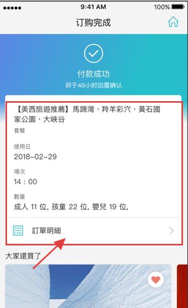 3、完成付款,跳转至【订购完成】页,显示【付款成功】及行程信息,可点击【订单明细】查询详细内容。
