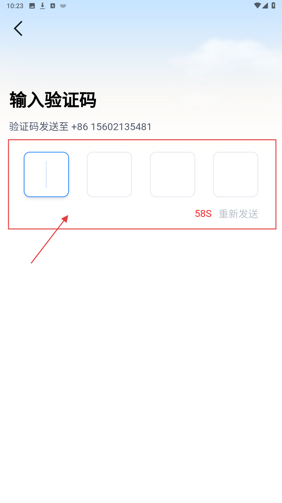 3、进入【输入验证码】页,收到验证码后填入对应框内,完成验证,登录应用。