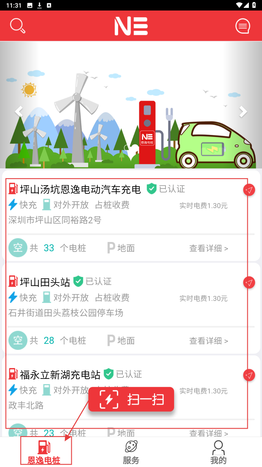1、打开“恩逸电桩”应用,在【恩逸电桩】页,查看充电桩列表,含快充、开放状态、地址、桩数等信息,点击【扫一扫】可扫码充电。