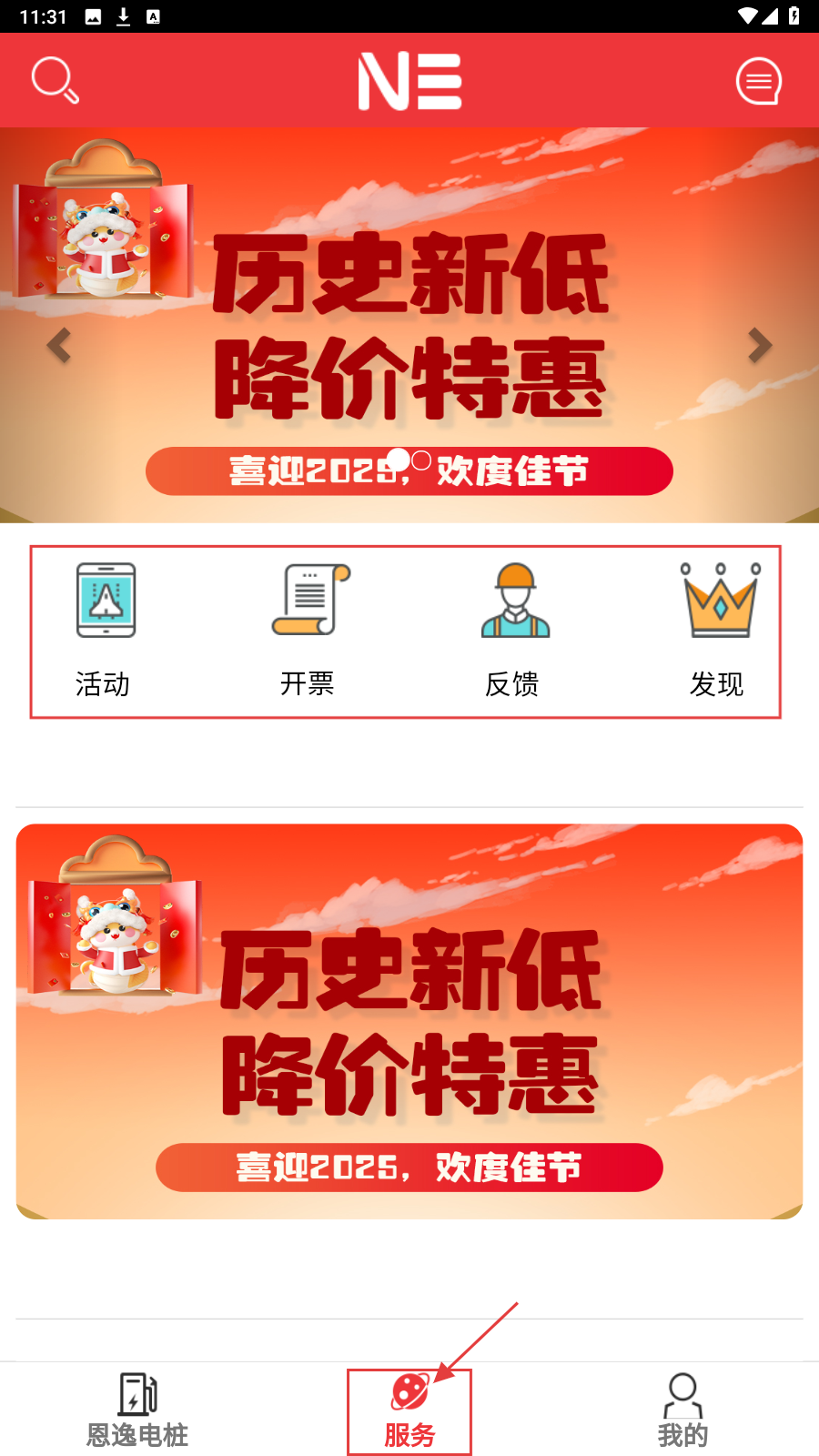 2、切换至【服务】页,有活动、开票、反馈、发现功能入口,还有降价特惠等营销内容,按需点击使用。