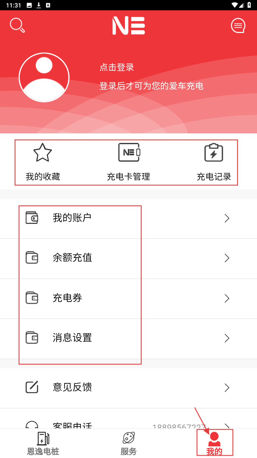 3、进入【我的】页,可进行登录,管理【我的收藏】【充电卡】【充电记录】,操作【我的账户】【余额充值】等,管理个人业务。