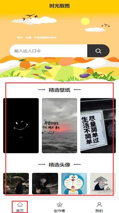 1、在“时光取图”【首页】,可搜索达人口令,浏览【精选壁纸】【精选头像】,按需点击查看。