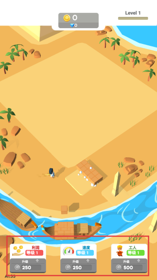 1、游戏开始处于Level1,关注屏幕上方金币数量,初始为0。优先考虑升级“利润”“速度”“工人”属性,前期可先升级利润和速度。