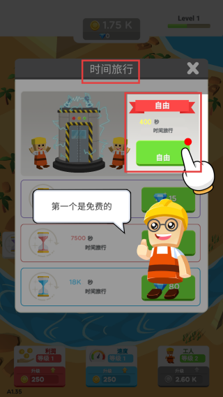 2、利用“时间旅行”功能,前期免费的400秒选项可快速推进游戏进程,获取更多资源。