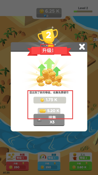 3、达到新等级时,及时收集免费硬币奖励,积累金币。持续升级属性,解锁更多游戏内容和功能,逐步扩大经营规模,提升游戏等级。