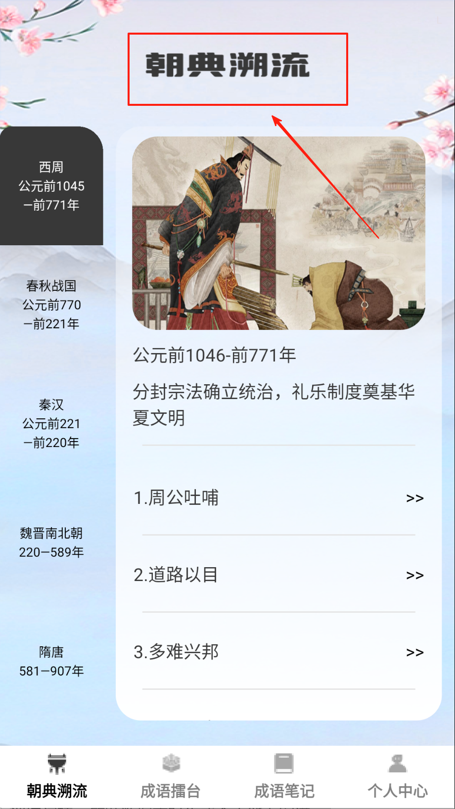 1、进入朝典溯流模块选择历史时期,系统展示该朝代代表性成语及其历史背景,点击成语卡片查看典故出处与近现代应用范例。
