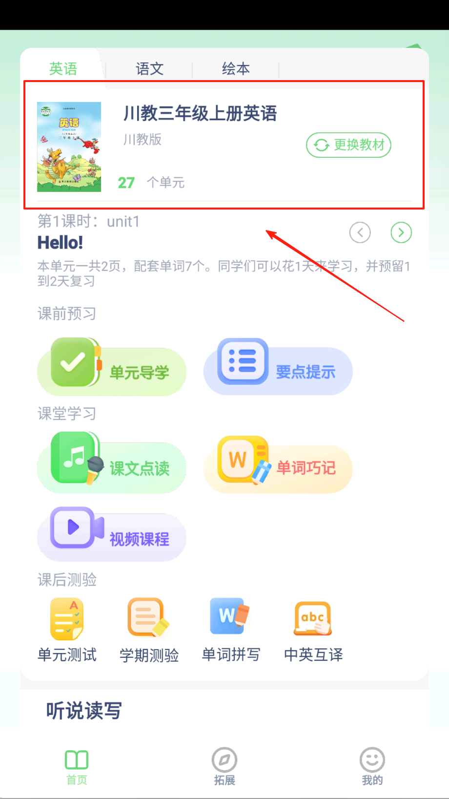 1、选择教材对应单元进入点读模式,手指点击课本句子触发纯正发音,长按单词可查看中文释义与音标分解,支持单句循环跟读练习。