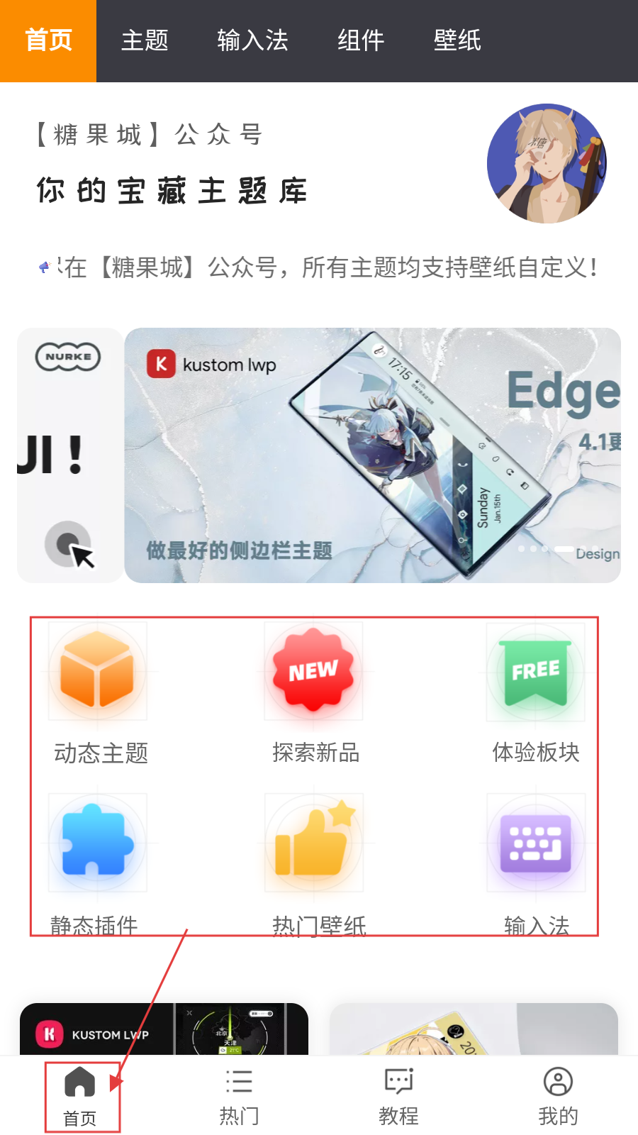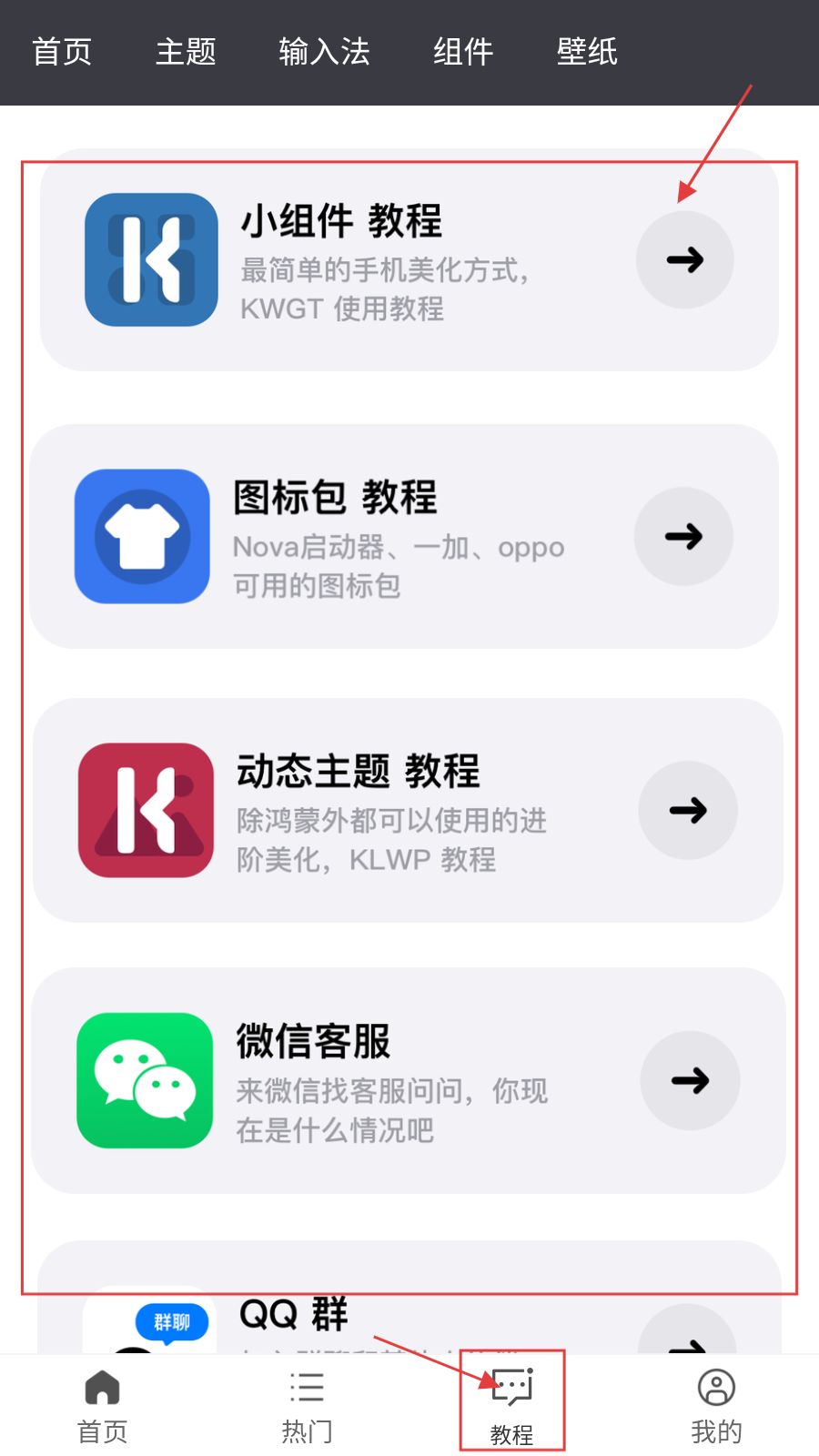 3、进入【教程】页,有小组件、图标包、动态主题教程及微信客服、QQ群入口,按需学习美化操作。