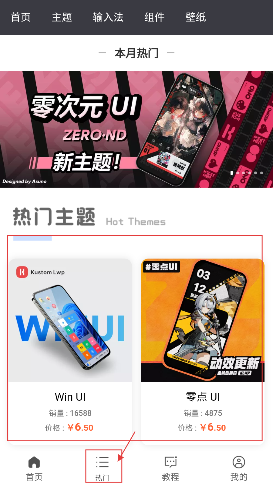 2、切换至【热门】页,浏览本月热门(如零次元UI)、热门主题(如WinUI、零点UI),查看销量、价格。