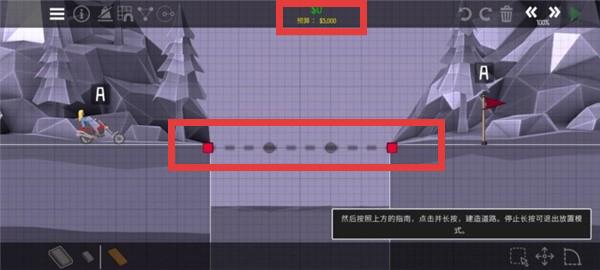 2、进入关卡后,注意上方预算资金(如$15,000),合理规划使用。按照提示“点击并长按,建造道路”,利用界面工具建造桥梁结构。
