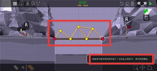 3、完成桥梁初步搭建后,点击右上角按钮进行桥梁模拟测试,检查桥梁是否符合通行要求。满足要求通过关卡,获取奖励并解锁新关卡。