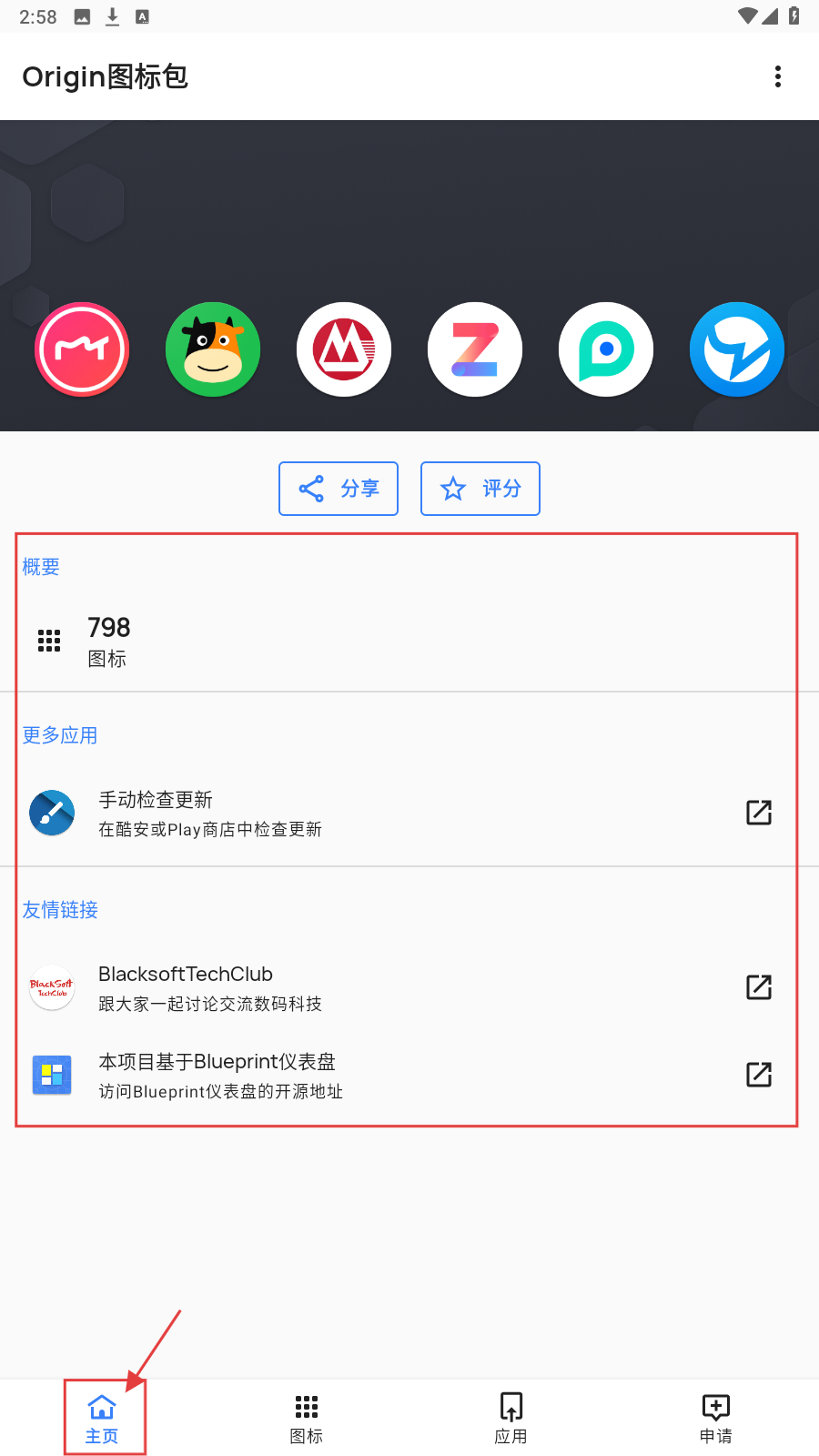 1、进入“Origin图标包”【主页】,可看图标数量(798个)、更新及友情链接(如BlacksoftTechClub),点【分享】【评分】可互动。