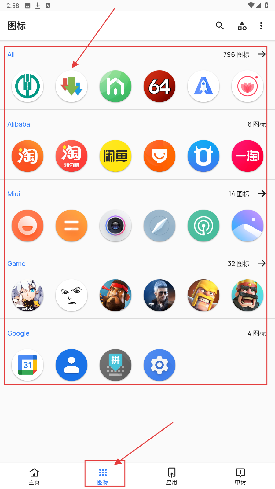 2、切换到【图标】页,按分类(All、Alibaba等)浏览图标,选喜欢的查看、使用。