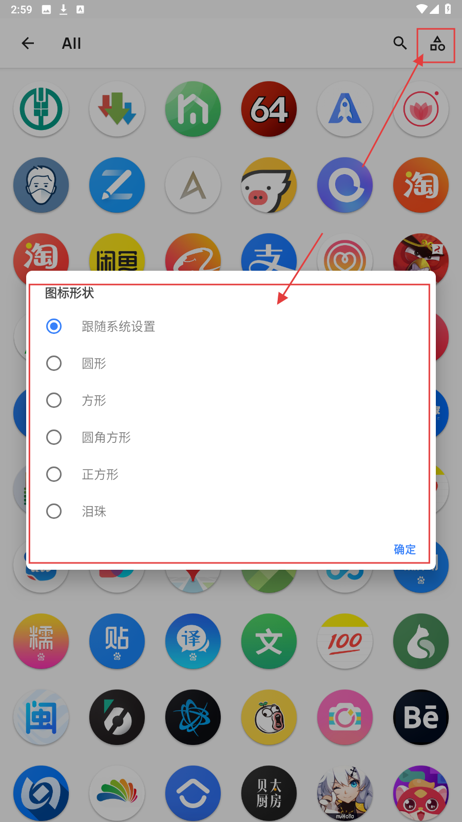 3、在【All】分类图标页,点右上角形状设置按钮,弹出【图标形状】选项(跟随系统、圆形等),选后点【确定】,可更改图标显示样式。