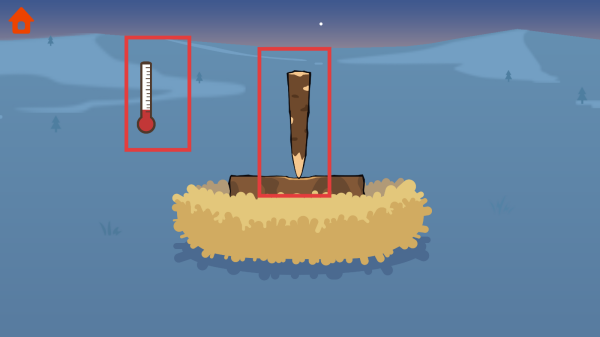 1、游戏开始,关注温度计数值,了解当前环境温度。通过操作木棍(可能是摩擦生火),收集生火材料。
