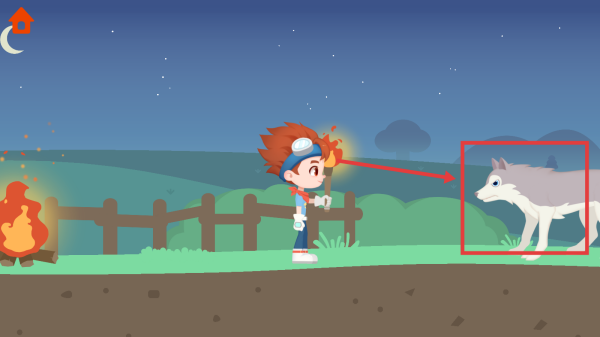 3、当遇到狼等危险生物时,手持火把进行防御,通过点击或滑动屏幕控制角色与狼的距离和方向,保障自身安全。
