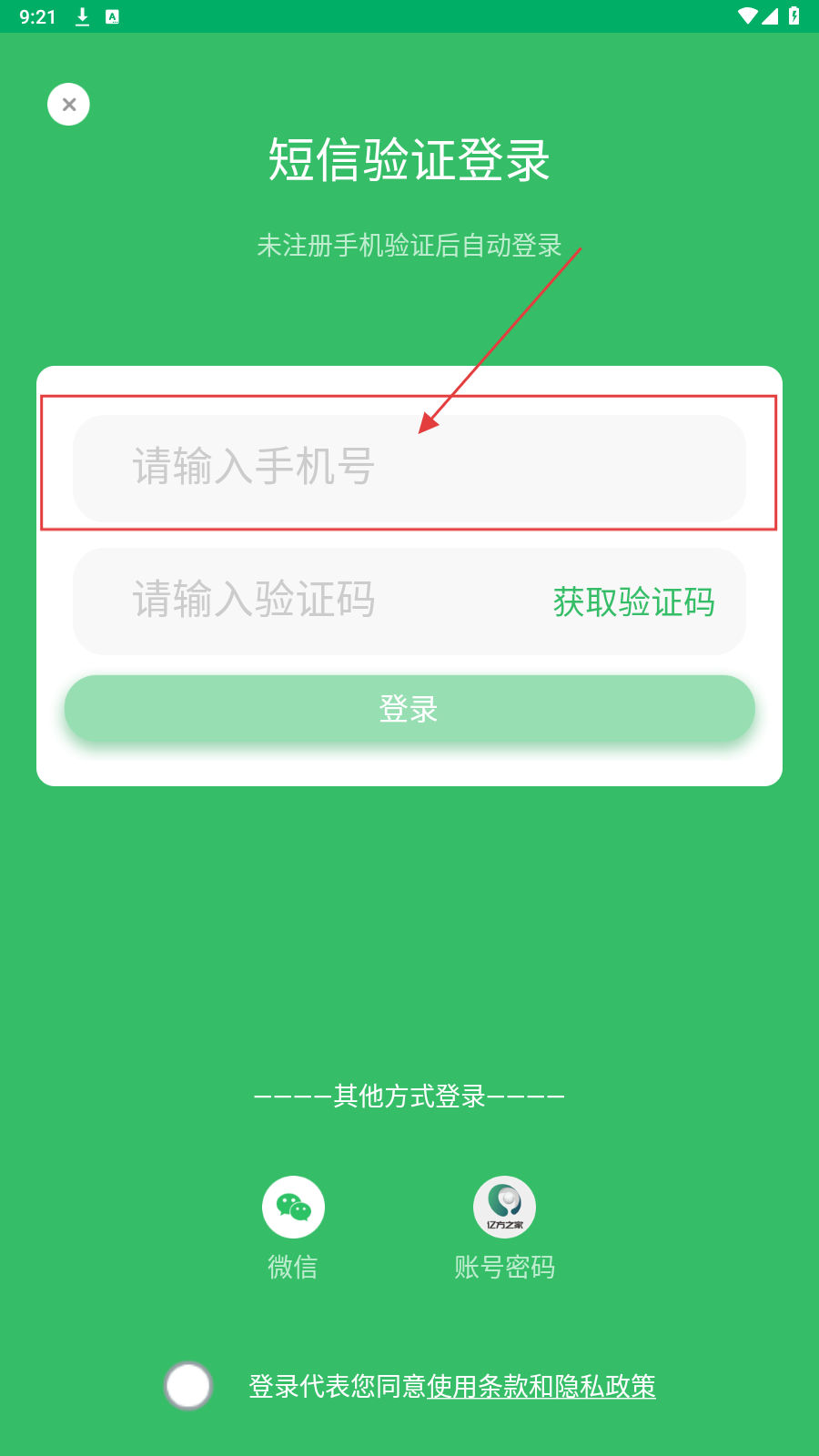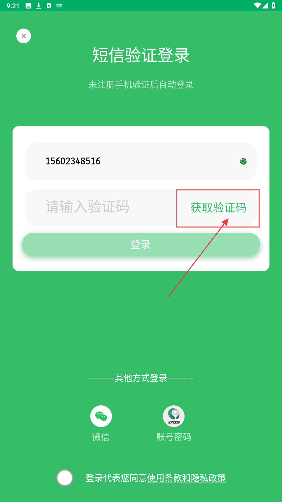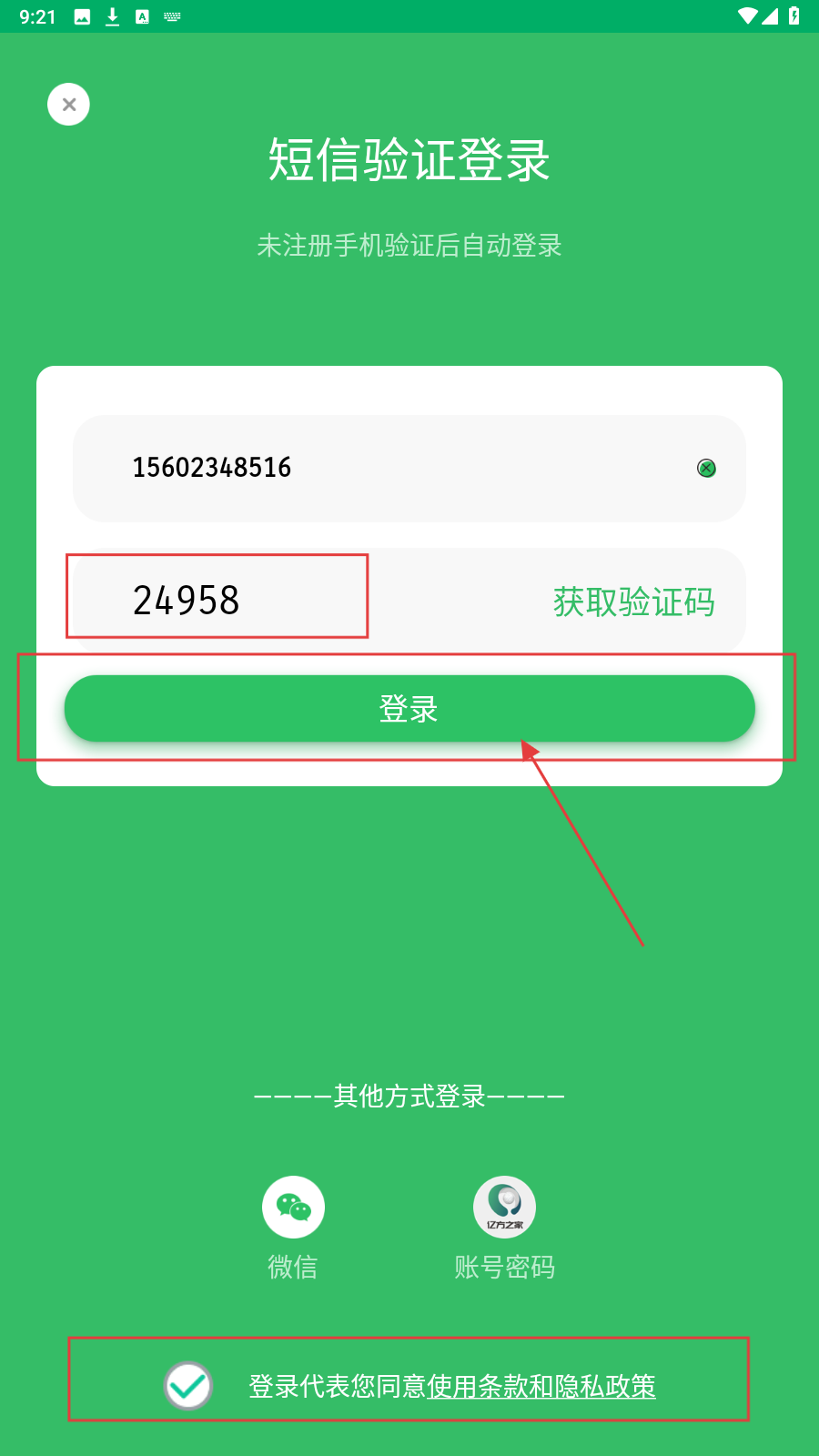 3、输入收到的验证码,勾选“登录代表您同意使用条款和隐私政策”,点【登录】完成操作。