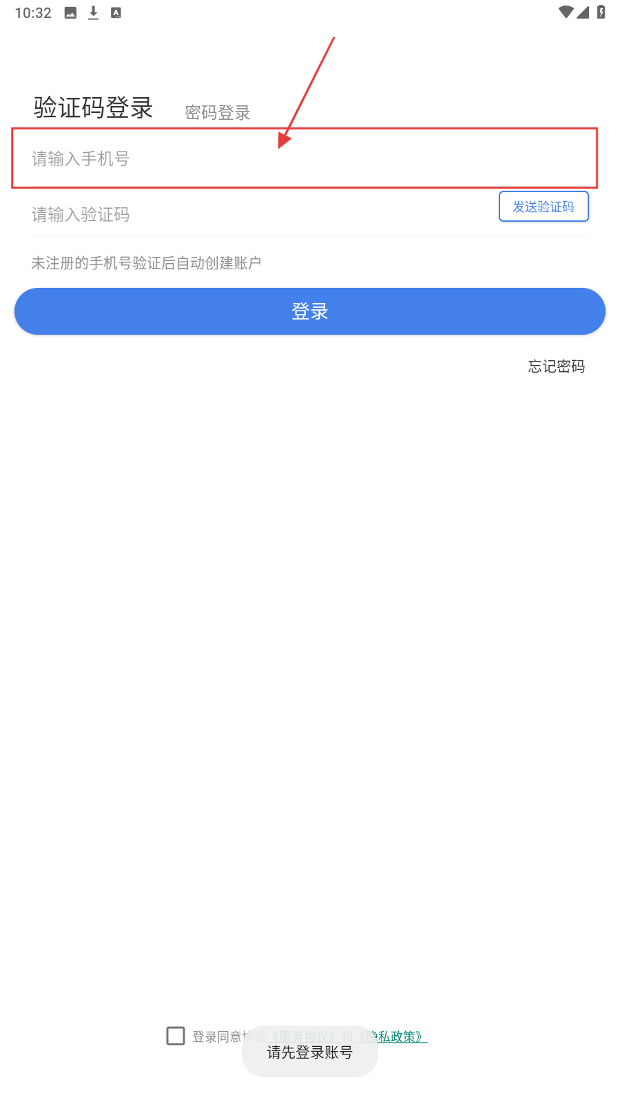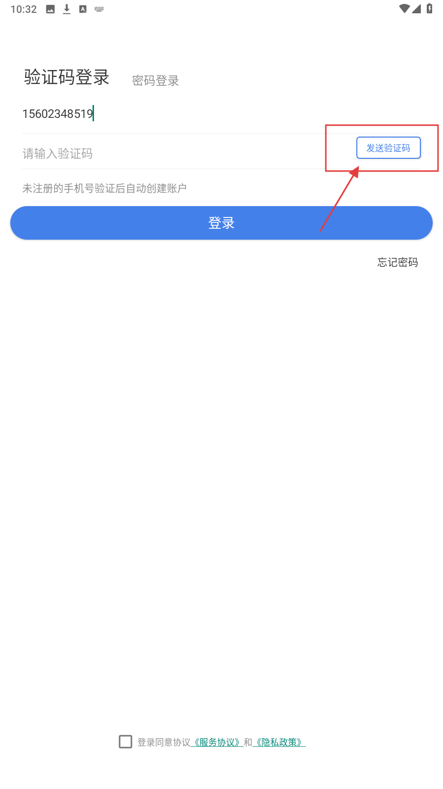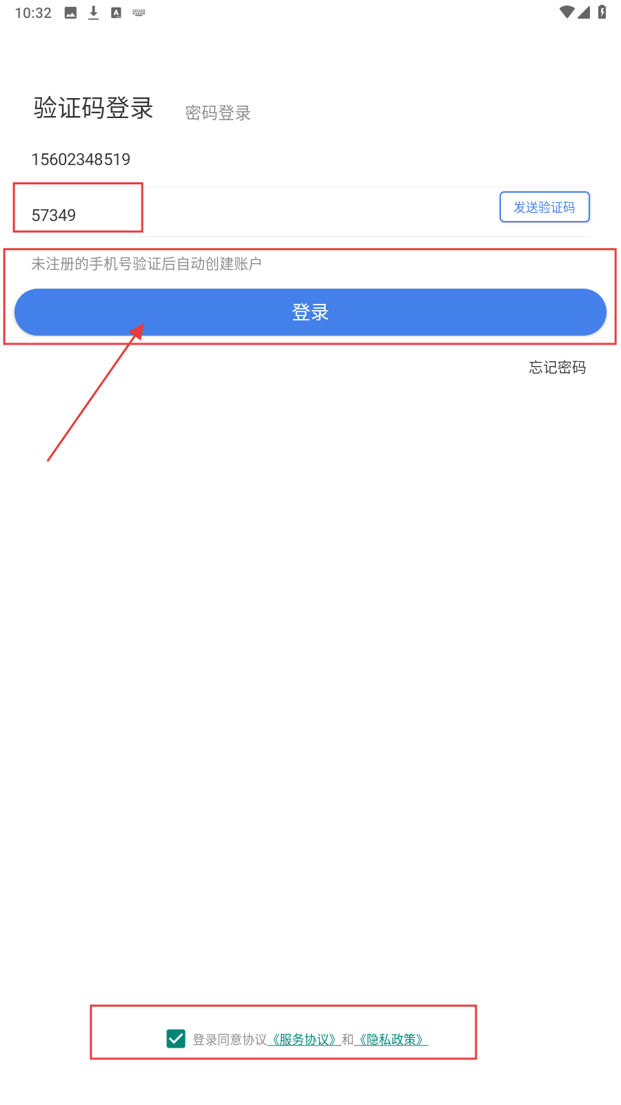 3、输入收到的验证码,勾选“登录同意协议《服务协议》和《隐私政策》”,点击【登录】完成操作,未注册手机号验证后自动创建账户。