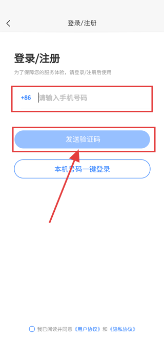 3、在【登录/注册】页,填手机号码,点【发送验证码】,接收并填验证码完成登录/注册,也可直接本机一键登录。