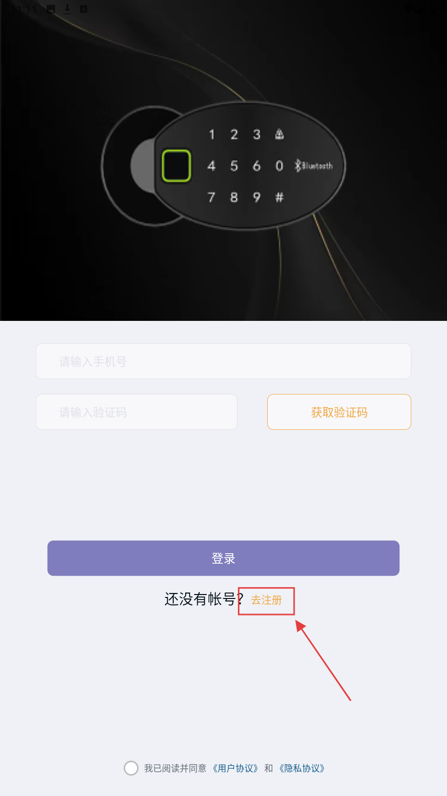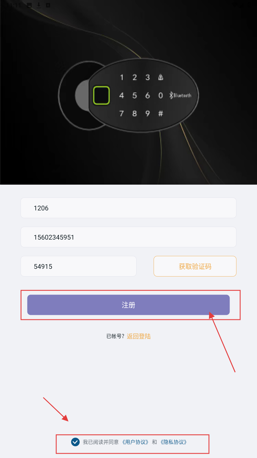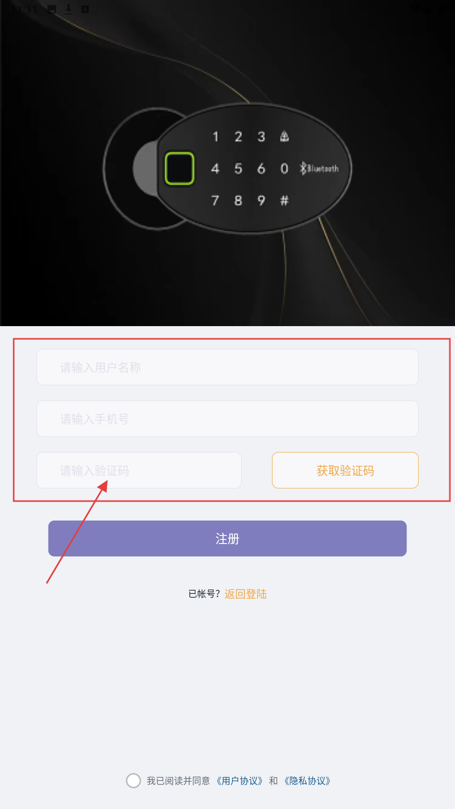2、到注册页,依次填用户名称、手机号、验证码,勾选“我已阅读并同意《用户协议》和《隐私协议》”。