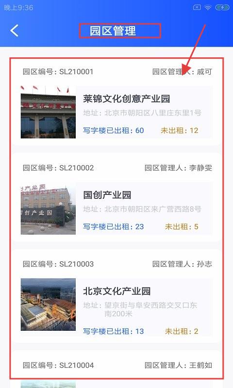 1、在【园区管理】页,显示多个园区信息,含编号、管理人、地址、写字楼出租情况,点击可查看详情。