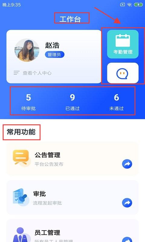 2、切换到【工作台】页,能看到用户、“考勤管理”等功能、待审批等数据、“公告管理”等常用功能,点击对应模块操作。