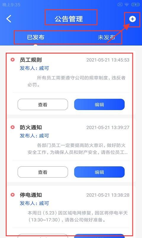 3、进入【公告管理】页,分“已发布”“未发布”,有“员工规则”等公告,可查看、编辑,点右上角“+”发布新公告。