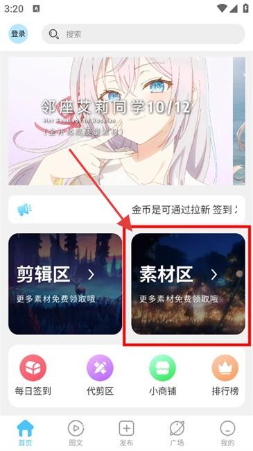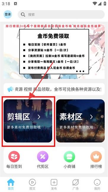 3、回到首页,点击【素材区】入口,可进入素材区获取更多素材,素材区与剪辑区均支持用金币兑换资源。