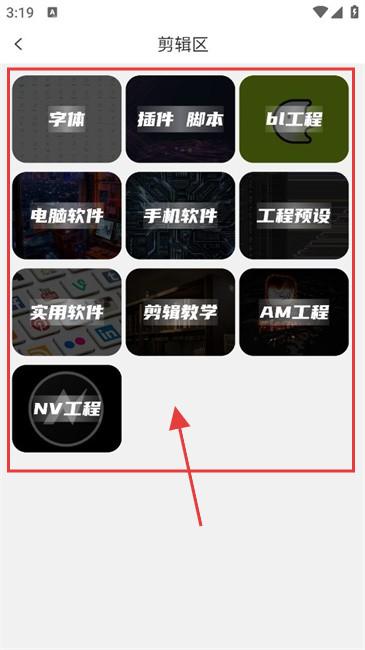 2、进入【剪辑区】,有“字体”“插件脚本”等10个分类(如电脑软件、剪辑教学),点击分类可获取相关剪辑资源。