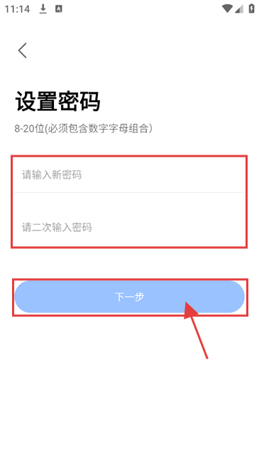 3、进入【设置密码】页,按要求(8-20位,含数字字母)填新密码并确认,点【下一步】完成注册。