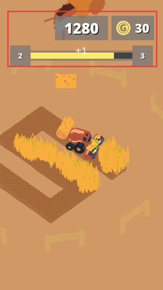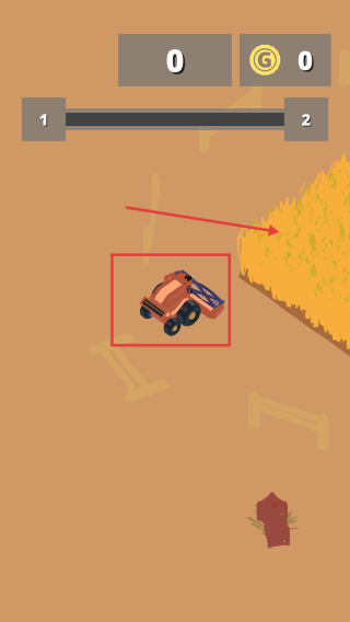 1、游戏开始,观察界面上方的计分板和进度条。计分板记录分数和资源数量,进度条显示关卡进度。操控收割机驶向干草区域进行收割。