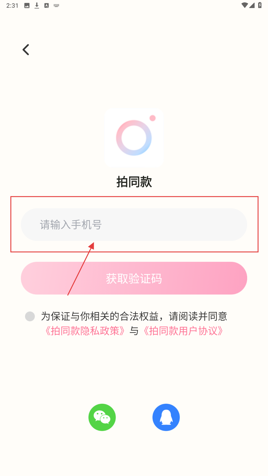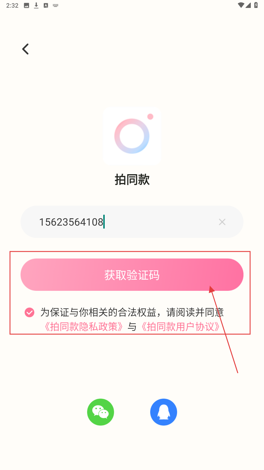 1、进入【拍同款】初始页,在手机号输入框填入号码,勾选同意相关协议,点击【获取验证码】。