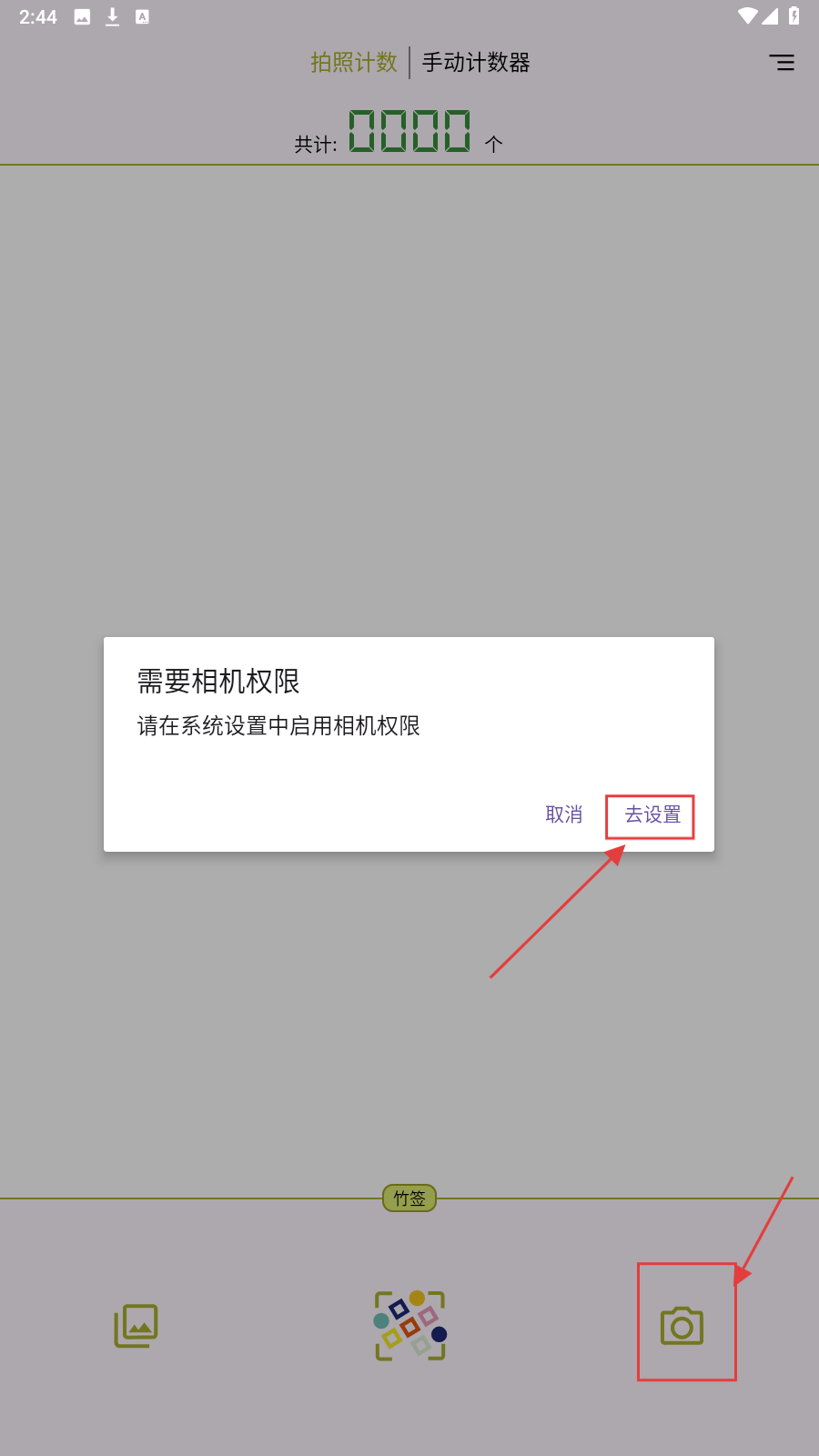 3、选好对象后,点击底部相机图标,若提示【需要相机权限】,点击【去设置】,在系统设置中开启相机权限。