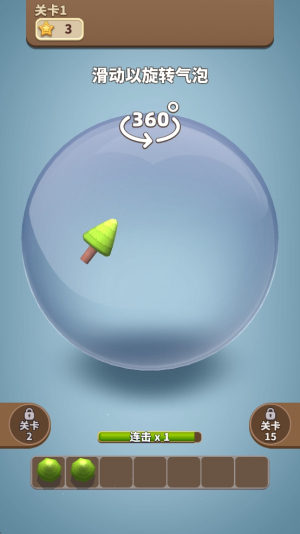 2、旋转泡泡:通过滑动屏幕旋转泡泡,使相同颜色的泡泡相接触并消除。
