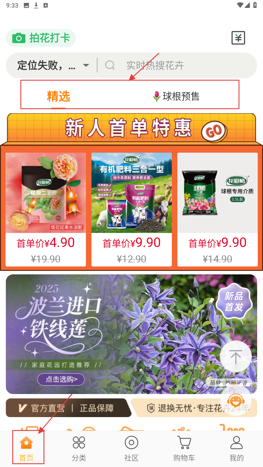 1、在APP【首页】,可切换【精选】【球根预售】,查看新人特惠商品(如花彩师肥料),点击选购。