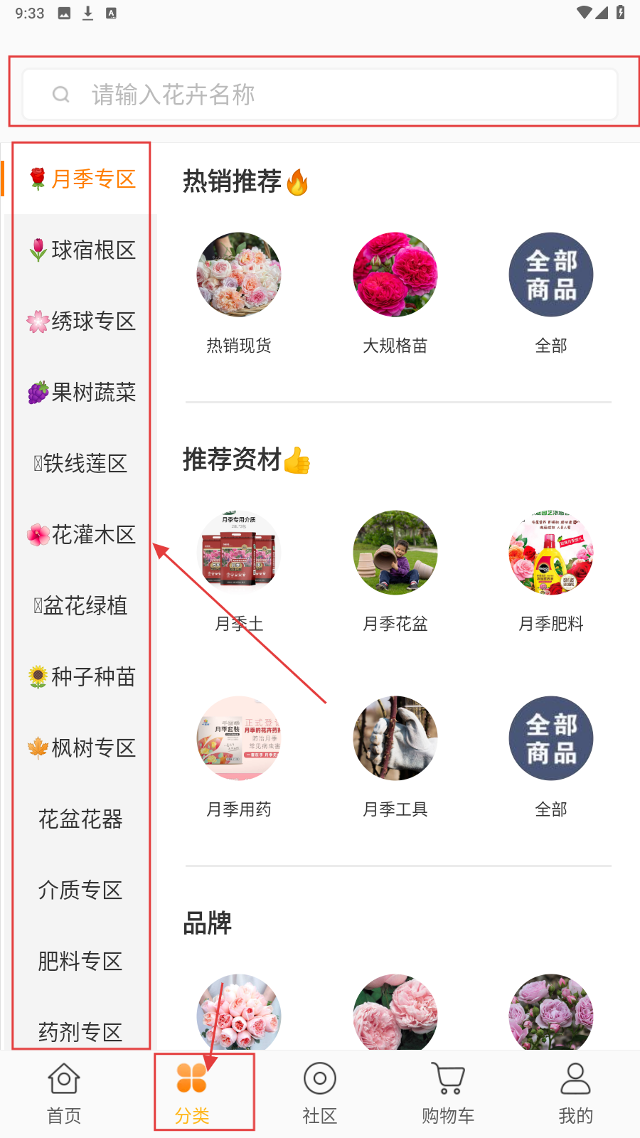 2、点击底部【分类】,进入分类页,有【月季专区】【球宿根区】等,可按分类找花卉、资材,点对应入口浏览。