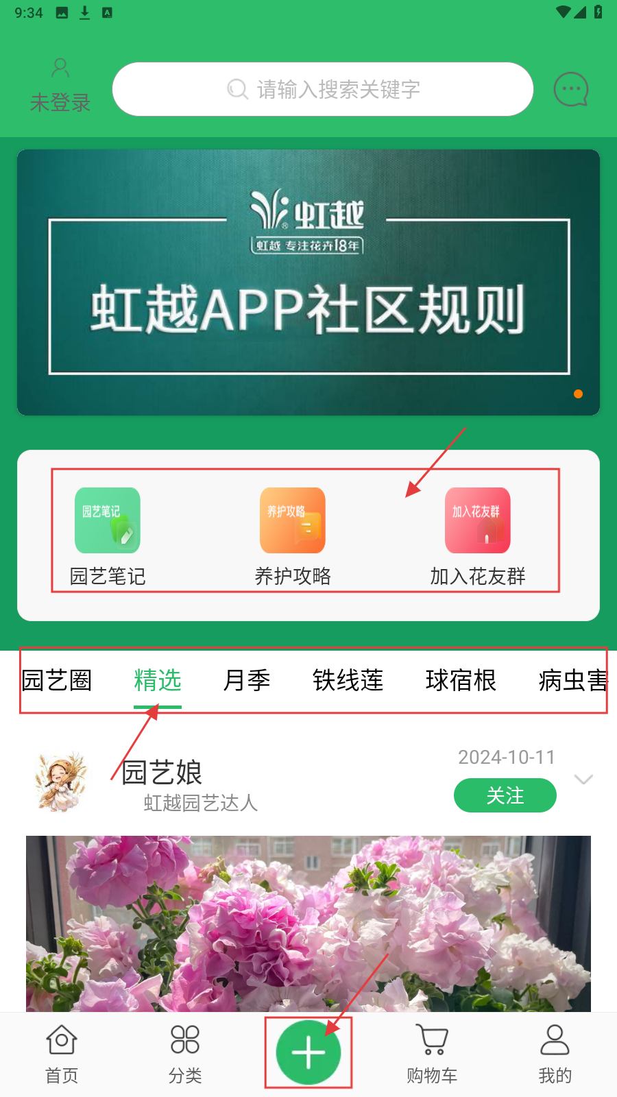 3、切换到【社区】页,有【园艺笔记】【养护攻略】等功能,可发内容(点底部“+”),也能看“园艺圈”精选、月季等板块帖子。